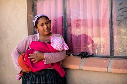 Sonia is one of three guide mothers in her village in Cochabamba Department, Bolivia. Here she is shown outside her house nursing her 11-month-old daughter, Liz.