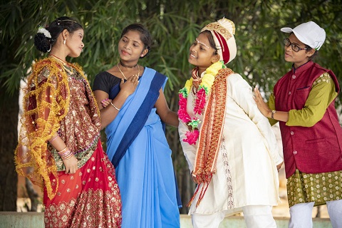 A group of young women in India perform a play demonstrating the dangers of child marriage.