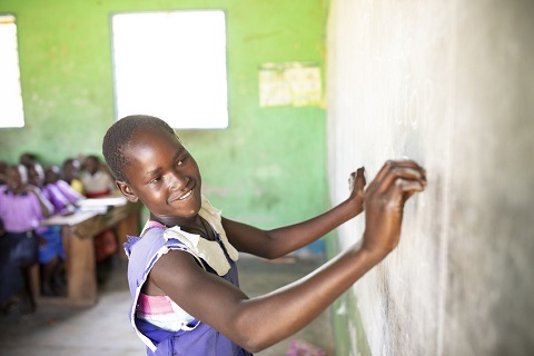Victa learns in her fourth grade classroom constructed by ChildFund in eastern Uganda.
