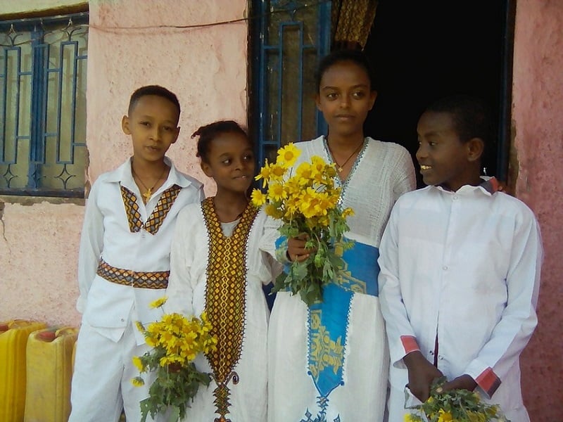 On Enkutatash, children have a special role to play, especially girls. Groups of young girls go door-to-door in the neighborhood carrying bright yellow flowers, beating drums and singing traditional songs. As a token of appreciation, the neighbors give out pieces of special holiday bread or a bit of pocket money. Children dress in new clothes, attend church services, eat a traditional meal with their families, and draw and paint pictures as gifts for others.