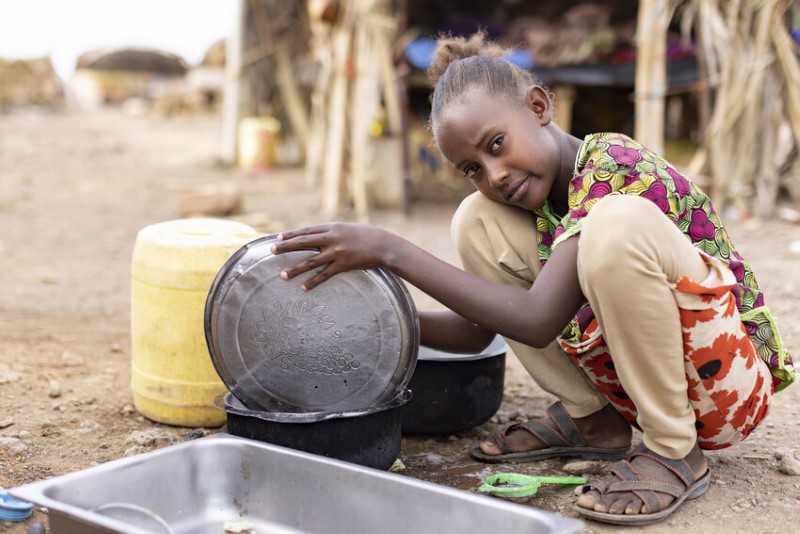 Kame, 9, washes dishes after a meal at her home in Marsabit County, Kenya. A record-breaking drought in East Africa has made food insecurity a near constant for her family.