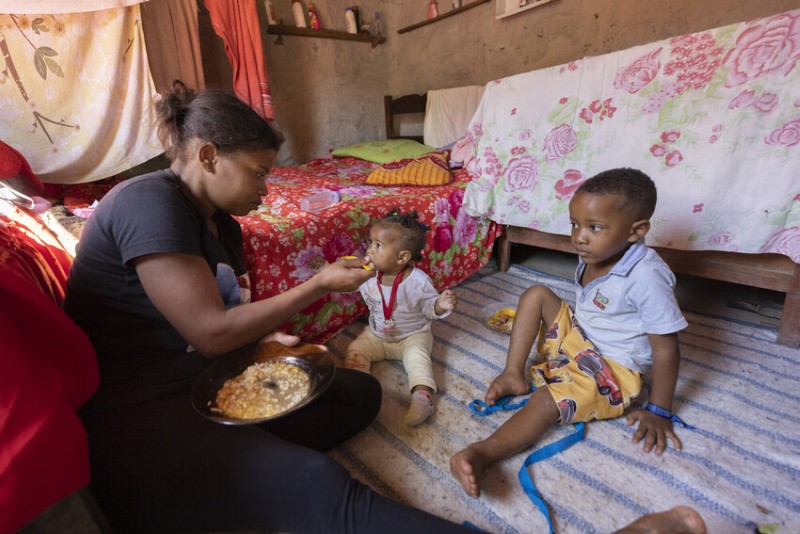 Isabela in Minas Gerais, Brazil, feeds lunch to her children, Isaac, 3, and Esther, 8 months. In just the last six months, the price of rice where she lives has doubled; meanwhile, the price of milk has tripled since the beginning of the pandemic. Fresh vegetables are too expensive to buy, so they’ve been relying on pumpkins they grow in the garden. “Food is our biggest worry,” Isabela says. “My daughter needs milk to drink, and I can’t afford it. We don’t eat meat very much, maybe just once a month. Things keep getting more expensive and more difficult. Only God can help us. If things get worse, we might starve.”