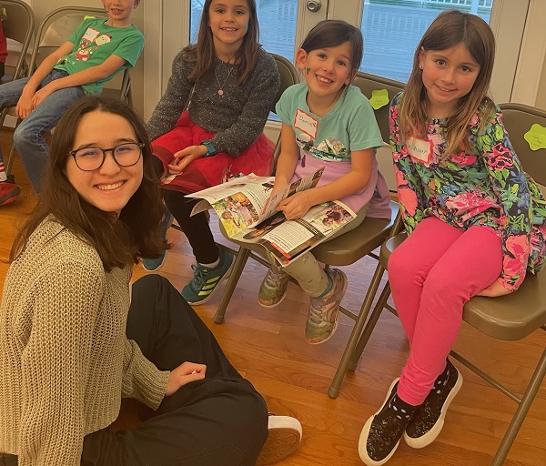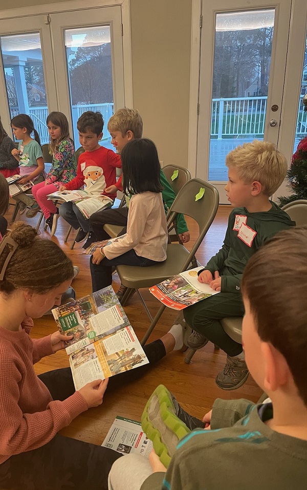 Children at Kathy’s annual Christmas party work with their high school “coaches” to choose their gift catalog items.