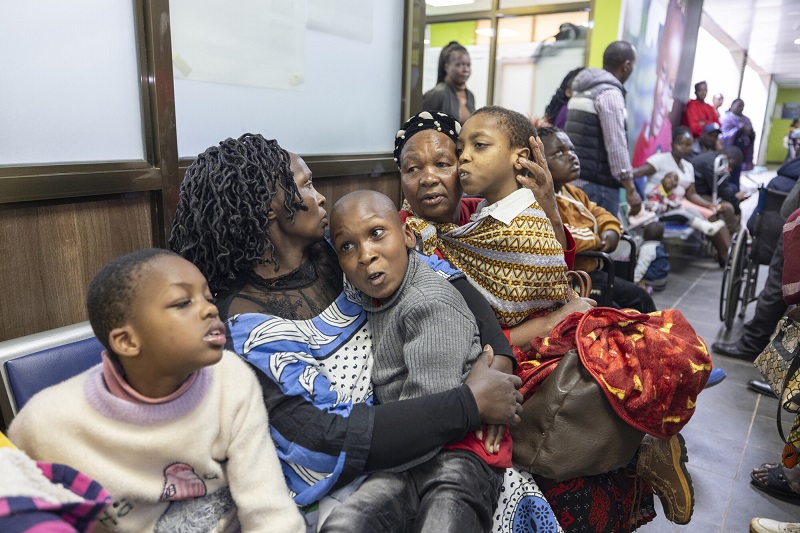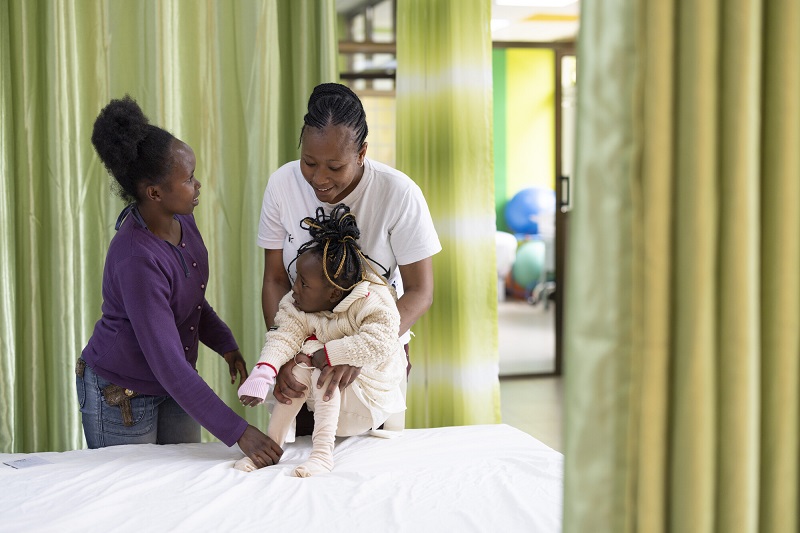 Four-year-old Monicah and her mom Josephine (25, in purple) are a few others who are grateful for the project. Here, Monicah is receiving an evaluation by occupational therapist Mary Njoroge at a local specialty hospital. Monicah, who is sponsored through ChildFund, has cerebral palsy and cannot walk, talk or eat solid foods – at least, not yet.