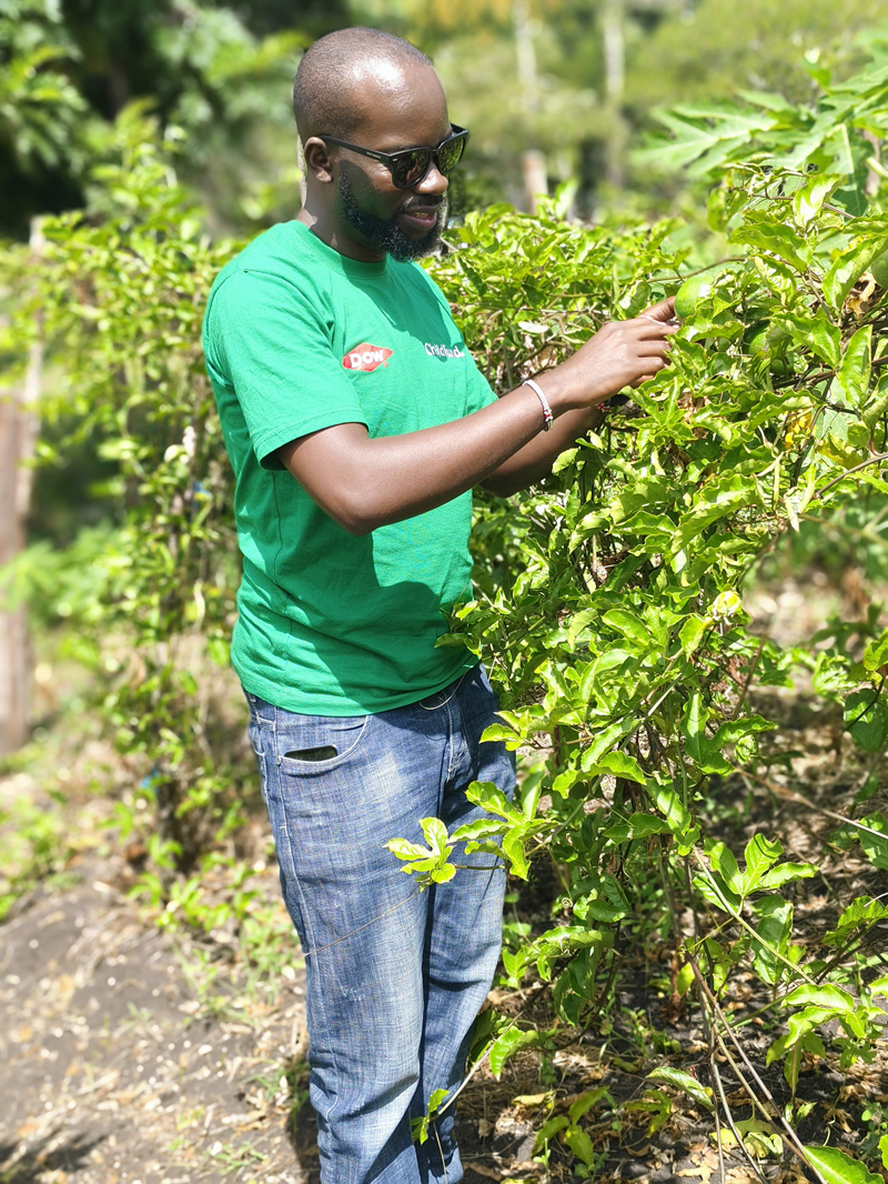 Kevin examines a passionfruit plant. He manages ChildFund's food security, livelihood and environmental adaptation work in Kenya.